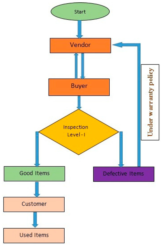 We discuss only studies that are related to imperfect-quality items, and in this field, a lot of authors have worked with nice contributions. In this subsection, we select some renowned authors. Salameh and Jaber [1] proposed an ordering policies model by using of inspection process. Biel, K., Glock [2] to solve for the predicted full worth per unit of time, during supply chain model and Jaggi and Mittal [3] also gave good contribution for the imperfect quality items. The numerous current studies have properly assumed—with unrealistic implications for supply chain management—that shortages are not acceptable. Unexpected requests or uneven manufacturing capacity may, in fact, occasionally cause shortages, which will affect supplier and store decisions. The model of Salameh and Jaber [1] was expanded upon by Wee et al. [4], who added shortcomings to each cycle. Eroglu and Ozdemir [5] expanded on Salameh and Jaber’s [1] research to take into account goods of lower quality during shortages. Roy et al. [6] and Sarkar [7] created an inventory model for deteriorating products of poor quality that were subjected to an inspection procedure, using faulty items as random variables. Jaggi et al. [8] have refined an EOQ mathematical model for degrading items with faulty quality under inspection when the screening rate is higher than the demand rate. Sebatjane and Adetunji [9] presented an EOQ-based inventory model with imperfect-quality items for growing items where the order quantity was calculated for the ordering policies. Ozturk [10] developed a production-based inventory model with shortage policies for defective items under a rework process and calculated the production quantity. Gautam et al. [11] described an inventory model with defective-quality items for a two-decade review. Jayaswal and Mittal [12] motivated by the literature review of Goutam et al. [11], developed an ordering-policy-based inventory model with inflationary conditions under an inspection process. In this direction, Narang and De [13] designed a production-based inventory model with a rework policy for defective deteriorating items under a genetic algorithm where the demand rate depends on the advertisement, time and selling price. Taleizadeh et al. [14] developed an economic production quantity inventory model for defective items under a rework process where lot size and backorder level were calculated for the system.