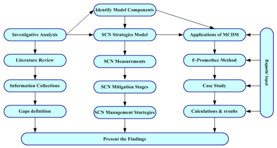 As shown in Figure 1, the research’s methodology includes an analysis of earlier studies, a collection of the required data and information, and a definition of the gaps in the previous studies, research questions, and contributions. The method of study in this research includes an analysis of recent nervousness in the supply chain, the main factors and strategies, the measurement methods, and the execution steps. Next, the supply chain nervousness strategies model is presented to designate the SCN measurements and indicators, mitigation strategies and stages, and management strategies. The suggestions explore the utilization of the SCN strategies to provide an innovative solution to the SC problem, to minimize the effect of nervousness on the SCs, and to improve SC resilience. After that, an MCDM approach is utilized to evaluate and prioritize five strategies based on six performance measures. Expert input data are employed in the fuzzy PROMETHEE method to rank the strategies based on their importance and order of implementation. The suggested methods and instruments for managing nervousness are then presented with a numerical case, along with the conclusions and recommendations.