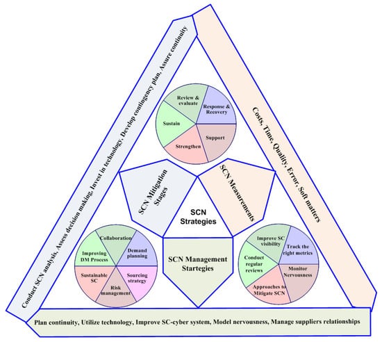 The appropriate nervousness mitigation measures are rarely examined in the literature. On the other hand, several mitigation strategies touched upon areas like risk, vulnerability, disruptions, and crises mitigations. Previous studies prioritized risk mitigation strategies for an environmentally friendly apparel supply chain using fuzzy TOPSIS []; identified and ranked the elements that contribute to supply chain vulnerability using the AHP technique []; examined the environmental impacts of food consumption and the corresponding mitigation measures, then developed a mitigation plan []; suggested disruption mitigation strategies to reduce loss due to supply disruption []; examined the COVID-19 impact manufacturing businesses’ supply chains and the appropriate mitigation measure using the grey-DEMATEL technique []; sought to mitigate supply chain disturbances resulting from the impact of natural disasters like the COVID-19 pandemic []; considered a company’s long-term strategic plan []; proposed a paradigm for controlling risk and uncertainty in the pharmaceutical supply chain []; examined how healthcare supply chain management has an effect on strategic goals and promotes excellent performance []; indicated that developing technologies are necessary for sustainable supply chain management to succeed in the future disruption []; and examined cover supply chain management gaps and how to close them during crisis situations [].