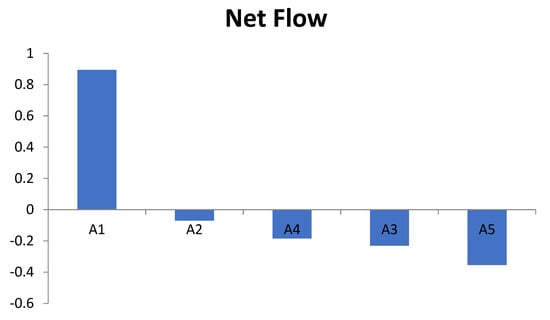 Then, using Equations (15) and , the fuzzy flows are calculated for each possibility. Equations (3) and (4) defuzzify the fuzzy leaving and entering flows. Defuzzification produced crisp leaving and entering flows, which are displayed in Table 10 as a result. The net flows are calculated and displayed in Table 10’s last column for a complete ranking.
