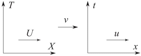 The notion of invariance with respect to frames moving with constant relative velocity underlies special relativistic mechanics, and in particular those transformations of space and time leaving the wave equation unchanged, and are referred to as Lorentz transformations. We consider a rectangular Cartesian frame and another frame moving with constant velocity v relative to the first frame, and the motion is assumed to be in the aligned X and x directions, as indicated in Figure 1. We view the relative velocity v as a parameter measuring the departure of the current frame from the rest frame , and for this purpose, we adopt a notation employing the lower case for variables associated with the moving frame and the upper case or capitals for those variables associated with the rest frame. Accordingly, time is measured from the frame with the variable T and from the frame with the variable t. Following normal practice, we assume that and , so that and are the variables of principal interest.