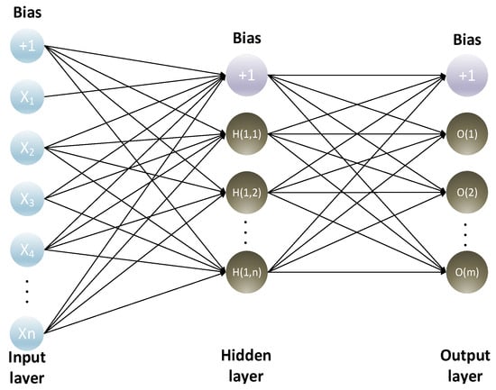 The RBFNN is a type of feedforward neural network renowned for its fast learning speed and strong local approximation capability []. As shown in Figure 2, it is composed of an input layer, hidden layer, and output layer, with each output layer containing multiple neurons. Currently, the RBFNN finds extensive applications in domains such as pattern recognition, function approximation, time series prediction, and control systems []. The fundamental concept is to nonlinearly map the input space to a higher-dimensional feature space, allowing the model to tackle problems that are not linearly separable. In the hidden layer, the output of the j-th neuron is as follows: