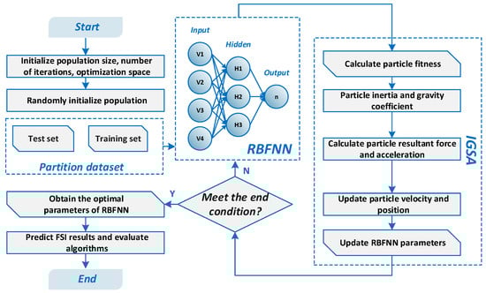 Despite the availability of various algorithms, such as Particle Swarm Optimization (PSO) and Genetic Algorithm (GA), for optimizing model parameters, existing optimization methods are plagued by premature convergence and a lack of efficient acceleration mechanisms. The Gravitational Search Algorithm (GSA) is an innovative optimization algorithm inspired by the law of gravity. By employing a chaotic perturbation operator, GSA addresses these issues effectively, which has been utilized for parameter optimization in machine learning, as cited in []. To ensure that the FSI prediction model achieves higher predictive accuracy and generalizability, this study employs GSA to optimize three critical parameters in the RBFNN []: the number of nodes in the hidden layer Cj, the spread value σj, and the network connection weights ωj. The optimization process ensures the reasonableness of the parameters and enhances the robustness of the predictions. The steps for constructing GSA are as follows.