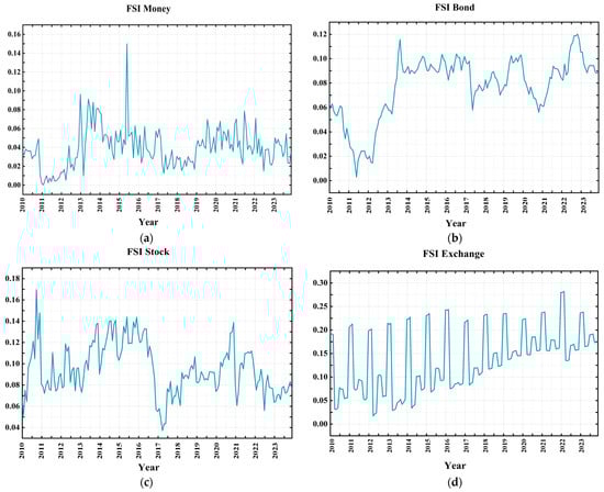 The Financial Stress Index (FSI) was introduced to enhance the measurement and visualization of risks within the financial system []. This comprehensive and objective indicator captures the instability arising from internal stresses and shocks [], thereby aiding national authorities in formulating fiscal policies based on an objective assessment of the current economic landscape [,]. Furthermore, this approach allows financial institutions to assess the liquidity of the financial market and systemic risks, thereby ensuring smooth operation of the financial system [].