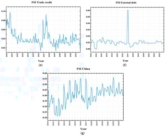 However, the majority of the aforementioned scholarly studies primarily evaluate stress indices based on financial markets; nevertheless, there remains an insufficient consideration of the sources of stress, which makes it prone to misjudging the trajectory of financial stress within said market. Consequently, Li et al. [] propose that the incorporation of the trade credit market as a variable in constructing the FSI for emerging markets and developing countries is imperative, particularly for the sampled nations. Due to the increasing acceptance of global integration, local enterprises are progressively enhancing their competitiveness and simultaneously resorting to trade credit as a market strategy for their products. Therefore, this study employs external debt and trade credit as substitute metrics to mitigate the absence of the aforementioned indicator system, aiming to capture financial stress in the selected countries for this research. After considering the aforementioned factors, the CFSI in this study encompasses six distinct components, as detailed in Section 3.