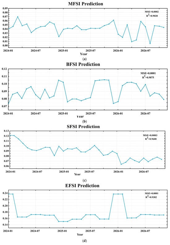 The accurate forecasting of the FSI in financial markets plays a pivotal role in safeguarding the security and stability of the national financial system, as well as supporting the consistent growth of the country’s real economy. The primary research methodologies employed for forecasting the FSI encompass statistical time series forecasting techniques alongside a plethora of contemporary machine-learning-based forecasting approaches. Wu [] achieved more accurate results by integrating an Auto Regressive Integrated Moving Average (ARIMA) model with a Back Propagation Neural Network (BPNN) for predictive analysis of future stress indices. Building on existing financial system risk models and incorporating the effects of time lags employed in the financial risk system, Wang et al. established a set of time-delayed financial system risk models through the analysis of the system’s dynamic behavior using chaos theory. Tiwari et al. [] analyzed the monthly data of the extracted financial stress index and the uncertainty index related to national policies, etc., and came up with the result that financial stress plays an pivotal role in shaping economic activities.