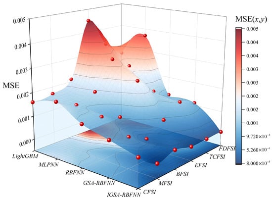 The artificial neural network (ANN) is characterized by its robust self-learning and self-adaptive properties []. It possesses the capability to effectively handle non-linear fitting problems, as well as adapt to multiple samples with high proficiency. The RBFNN is extensively employed in accuracy estimation and data prediction due to its utilization of radial basis functions as the activation function. Zhang et al. [] constructed a neural network model based on a particle swarm algorithm coupled with a radial basis to enhance the accuracy estimation of the flow layer zenith delay, and the results show that the integrated model effectively enhances the estimation accuracy of the model prediction. The RBFNN model effectively enhances the precision of approximation and possesses a more streamlined structure compared to other neural networks. Simultaneously, as a feed-forward neural network, the RBFNN model demonstrates exceptional capability in accurately approximating non-linear functions with arbitrary precision. This not only confers an advantage in solving non-linear fitting problems but also demonstrates a faster convergence rate and enables separate learning, thereby establishing it as an ideal tool for predicting intricate phenomena. Despite the excellent performance of the RBFNN in various prediction aspects, the challenge of parameter selection for RBFNN remains persistent []. The parameters of the RBFNN can be optimized using various optimization algorithms such as Particle Swarm Optimization (PSO) [], Genetic Algorithm (GA) [], Simulated Annealing (SA) [], and GSA [] for neural network training. Compared to other algorithms, GSA possesses superior global search and parallel processing capabilities, albeit with a slower training speed. Therefore, in this paper, we propose a novel three-dimensional optimization method based on GSA and develop a new IGSA-RBFNN prediction model []. Utilizing this IGSA-RBFNN model for FSI prediction analysis can provide valuable insights into exploring financial risks.