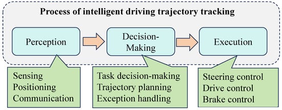 In recent years, distributed drive autonomous vehicles (DDAVs), integrating distributed electric propulsion, have emerged as a pivotal direction in automotive technological advancement because of their notable advantages in energy efficiency, environmental friendliness, rapid response, simple structure, and high transmission efficiency [1,2]. As illustrated in Figure 1, the realization of intelligent vehicle trajectory tracking involves three main stages including perception, decision-making, and execution. Execution (motion control) represents the final frontier in intelligent driving, with trajectory tracking standing at its core. This involves orchestrating the longitudinal and lateral motion control of vehicles through the control of chassis systems such as drive, braking, and steering, enabling precise tracking of desired longitudinal velocities and timely arrival at corresponding reference trajectory points [3]. It is evident from this analysis that the execution phase, encompassing longitudinal and lateral vehicle motion control, constitutes a pivotal determinant of the precision in vehicle trajectory tracking. Simultaneously, the speed of computations plays a crucial role in determining the efficacy of control, particularly in hazardous scenarios. The enhancement of computational speed in the execution phase is therefore vital for improving safety measures. Hence, augmenting both the precision of control and computational speed within the trajectory tracking execution phase emerges as imperative for the advancement of intelligent vehicle driving technology.