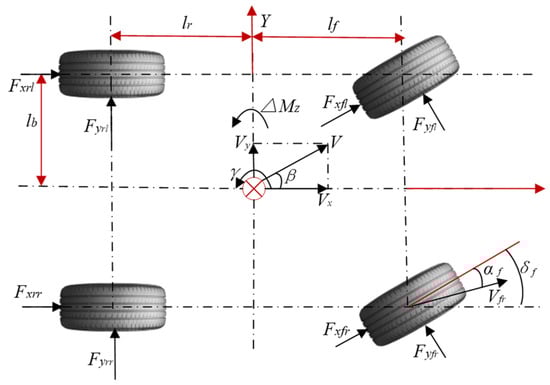 In the above equations, represents the total vehicle mass; is the longitudinal force of the tire; is tire lateral force (i represents the front wheel or rear wheel, and j represents the left wheel or right wheel); denotes the longitudinal velocity of the vehicle; represents the lateral velocity; is the yaw rate of the vehicle; is the yaw inertia coefficient of the vehicle; is the average front wheel steering angle; is the sideslip angle; and are the distances from the center of gravity to the front and rear axles, respectively; is half of the wheelbase; and is the forward speed of the vehicle.