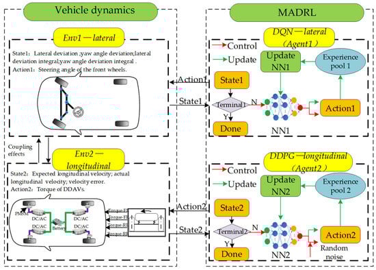 To address this, our study applies multi-agent systems to the trajectory tracking task of distributed-driven vehicles with distributed drive characteristics. Based on this idea, we propose a distributed drive autonomous vehicle (DDAV) trajectory tracking control method based on multi-agent deep reinforcement learning (MADRL), as illustrated in Figure 2. The main contributions are listed as follows: