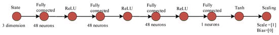 The control problem of the lateral control agent is described as shown in Equation (8), where is the set of observed values generated by the environment, defined as the lateral position deviation in the vehicle, the yaw angle deviation of the vehicle, and their respective rates of change and . is the set of action spaces, defined as the front wheel steering command . is the reward and punishment function evaluating the performance of the steering controller. To ensure the accuracy of trajectory tracking while minimizing the output of unnecessary steering actions, the reward and punishment function consists of position deviation and its rate of change, yaw angle deviation and its rate of change, and front wheel steering action; is the weight coefficient. In this paper, for the convenience of training the agent, it is necessary to normalize each component of the reward and punishment function before input.