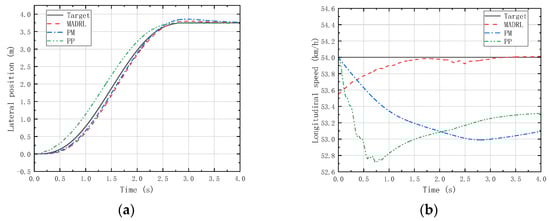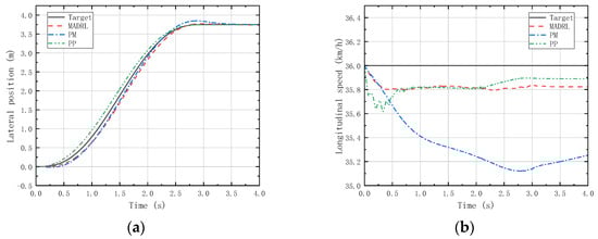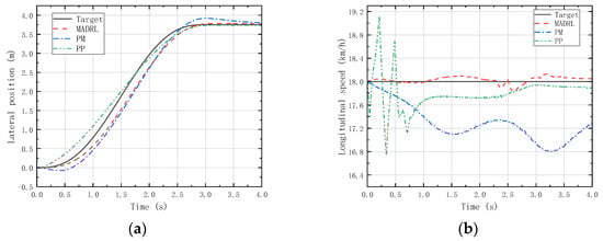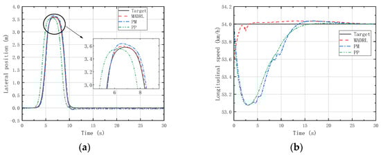 Figure 12 shows that in the LC experiments, MADRL enables the vehicle to complete the LC maneuver more accurately within the specified time compared with classical control methods, with smaller lateral overshoot and maximum longitudinal velocity deviation compared with classical control methods. Figure 13 reveals that in the DLC experiments, MADRL exhibits a smaller maximum lateral position deviation and better robustness in longitudinal velocity. The deviation between longitudinal velocity and the desired longitudinal velocity remains consistently low, with a maximum longitudinal velocity deviation not exceeding 0.14 km/h, and the longitudinal velocity deviation under stable vehicle operation does not exceed 0.04 km/h. Although MADRL exhibits extremely small deviations in longitudinal velocity under stable vehicle operation, this minimal deviation is due to constraints imposed by the characteristics of the reinforcement learning algorithm itself. Specifically, after achieving all the reward and penalty metrics in the reward function, the algorithm no longer actively pursues further optimization, as doing so would not lead to higher rewards or lower penalties for the intelligent agent.