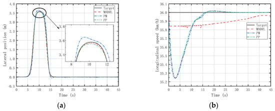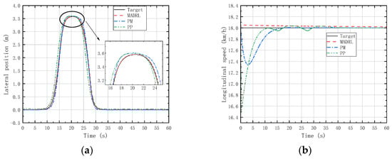 (a) Vehicle lateral displacement (18 km/h-DLC). (b) Vehicle tracking speed (18 km/h-DLC).