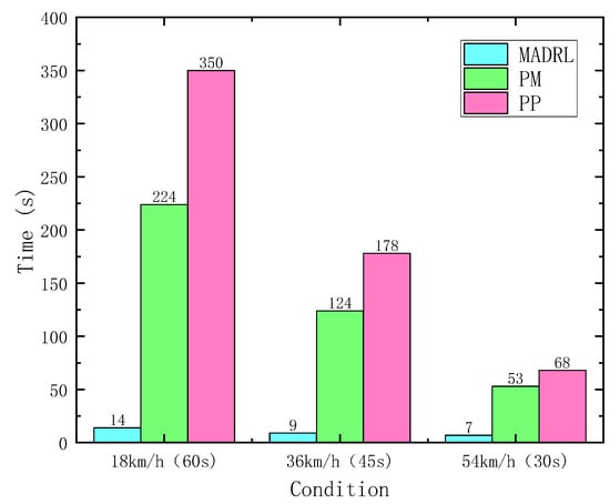 On the other hand, computational efficiency stands as a significant indicator for assessing the performance of strategy algorithms. The time consumption for different control strategies during the operation of DDAVs in a dual-lane change scenario is illustrated in Figure 18. When conducting a 60 s DLC experiment at 18 km/h, the time consumed by MADRL is approximately 6% of that by PM and 4% of that by PP. At 36 km/h for a 45 s DLC experiment, MADRL consumes approximately 7% of PM’s time and 5% of PP’s time. Likewise, at 54 km/h for a 30 s DLC experiment, MADRL consumes approximately 13% of PM’s time and 10% of PP’s time. Hence, the trajectory tracking control method based on MADRL in this study exhibits higher computational efficiency and lower computational resource requirements compared with classical control methods.