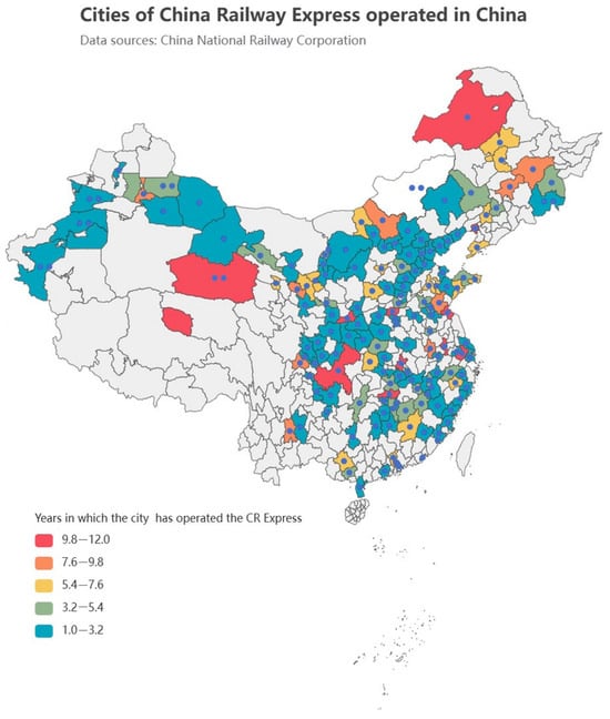 Since the initiation of CRE services in 2011, numerous LGs in various Chinese cities have consistently provided substantial subsidies to support CRE operations. This initiative aims to promote the route and catalyze local economic development. LGs base their subsidies on factors such as the number of containers or the converted column count, directly supporting OPEs responsible for CRE operation and management []. However, this subsidy mechanism has led to intense competition for cargo sources and market disorder [,]. Additionally, to secure government subsidies, some OPEs engage in practices such as carrying empty loads and submitting fraudulent subsidy claims. This has resulted in financial pressure on LGs. Meanwhile, the number of Chinese cities operating the CRE continues to rise, as illustrated in Figure 1, showing substantial variations in the years of their operations. This disparity in operational histories creates a contrast in the developmental statuses and support policies for the CRE between cities. Disparities in the start-of-operation timelines across different cities have led to significant variations in the subsidy standards, as depicted in Table 1.