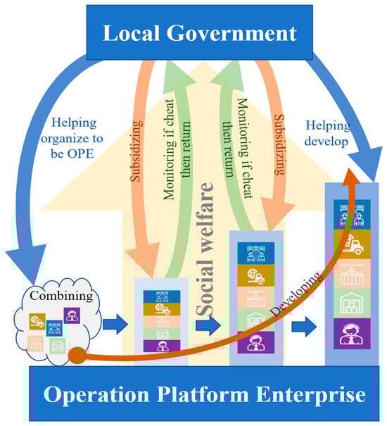 To solve the above problems, we analyzed the characteristics of the operation system of the CRE. By combing the modes of operation of the CRE in various cities, the subjects related to the subsidy-operation behavior are the local government and the CRE operating enterprises. The CRE market’s daily operations constitute a dynamic gaming process, involving LGs employing subsidies and other supportive policies to aid OPEs in their formation, development, and growth. OPEs, in turn, decide whether to operate the liner, aiming to maximize their interests and generate social welfare, such as tax revenue and employment opportunities for society. This game involves dynamic flows of capital and information within the operational market, and the subsidy policy and operational status of the CRE undergo continual and dynamic evolution, as expressed in Figure 2. It has been explained that the number of cities where the CRE operates has reached 217 (i.e., there are no less than 217 LGs). The number of OPEs is even larger. Therefore, the ever-increasing number of cities and enterprises operating the CRE has obvious characteristics of the population.