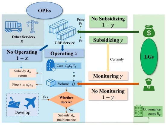 In China’s CRE system, each city’s LG partners with an OPE, offering policies like container-based subsidies to enhance CRE services. OPEs leverage these benefits to lower rates and upgrade services, driving economic growth. LGs also ensure market stability by backing alternative transport when CRE operations falter. Stringent subsidy oversight with penalties deters misuse yet balances autonomy for OPEs. This dynamic interplay is captured in an evolutionary game model assessing the strategic interactions between OPEs and LGs: