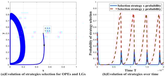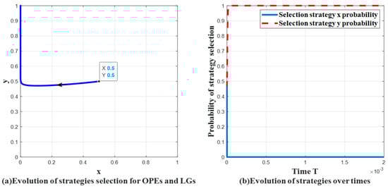 In Case 5, if the total expenditure on subsidies and supervision costs by LGs is lower than the cheating-punishment intensity, specifically when the penalty is notably severe, the government’s subsidy strategy aligns with the probability of OPEs operating the CRE. Consequently, the firms’ strategy shifts from subsidization to no subsidization over time. Figure 6 illustrates the evolutionary trajectory of the LGs in the cities where the CRE operates under the two cases.