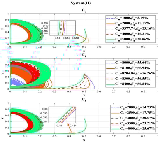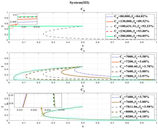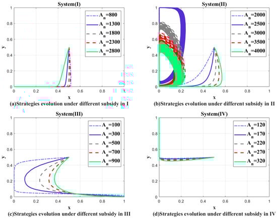 Case 4: if , that is, , then , and for the two solutions and for Equation (11), , ; then, is the only ESS, and LGs will adopt a non-subsidy strategy.