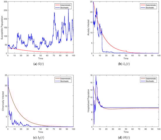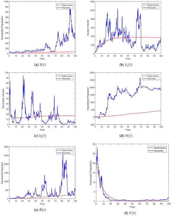 In this subsection, we attempt to numerically verify the persistence of HBV in the population. Theoretically, Theorem 3 explains the mean existence of the infection within the population. The theorem states that whenever the hypothesis is true, the conclusion follows. Figure 3 represents model (3) persistency for both deterministic and stochastic form. To prove the persistence of the stochastic model (3), we will consider values of the parameters as { }. These values of the parameters satisfy the assumption of the theorem and, hence, by closely observing the graphical results in Figure 4, one can follow the conclusion of the theorem. The figure shows that all the solution curves persist in the mean, indicating that the disease will not vanish over an infinite time span. In this scenario, the deterministic curves will approach the endemic fixed point, while the stochastic curves will oscillate around this endemic state of the model. Here, the amplitude of the oscillations depends on the intensity of the noises.