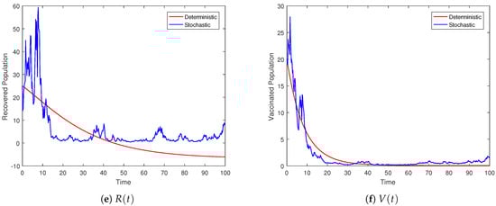 Figure 2 depicts the trajectories of the compartments for different scenarios. We can observe that the stochastic curves fluctuate around the infection-free state of the associated deterministic system. The intensity of the noises is directly related to the amplitude of the oscillations. Smaller values of lead to oscillations with smaller amplitudes, and negligibly small values result in almost deterministic curves. For the threshold parameter , associated with the deterministic model, the DFE is globally stable. Under the same condition on the parameters, the proposed model (3) with Lévy jumps approaches the infection-free state as time evolves. Theorem 2 ensures disease elimination whenever the hypothesis holds true, as reflected in Figure 2 via the simulation model (3). The graphical illustrations show that Theorem 2 is guaranteed whenever the threshold number .