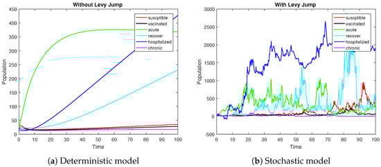 Apart from the above-mentioned scheme, one can utilize an alternative numerical method like the positive preserving truncated Euler–Maruyama (PPTEM) method [] to obtain numerical solutions to the model. PPTEM techniques have also been used by several authors and certain complex problems have been tackled therein; see [] and the references cited therein. In this case, the choice of this approach is prompted by its simplicity and effectiveness in managing Lévy jumps.