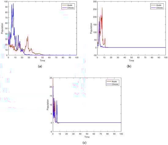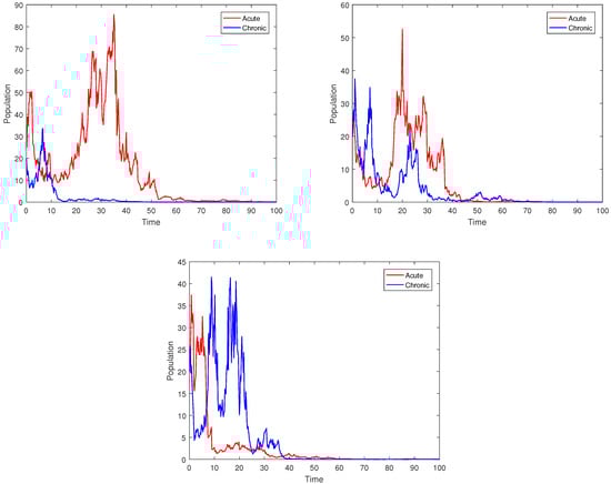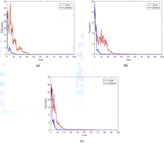 To show the relative impact of the parameter on the dynamics of the stochastic model, we take values of the parameters, such as , , and , along with other parameters, such as { }. Figure 7 shows the dynamics of the acute and chronic populations and the average relative infections using the suggested stochastic model. The figure suggests that lowering the value of accelerates disease extinction in the respective populations. This means that to accomplish disease extinction, the values of should be reduced. Furthermore, our simulations demonstrate the significance of using nonlinear stochastic disturbances in order to better understand HBV dynamics.