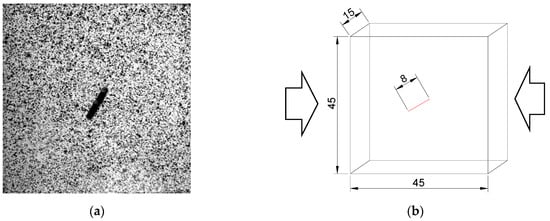 Before the test, the end faces of the specimens were polished to control the non-perpendicularity and non-parallelism of the end faces within ±0.02 mm [16]. At the same time, the surface of the square specimen was cleaned up, and white paint was used to uniformly spray on the surface of the sandstone, following this, the black pigment was randomly covered on the white pigment to obtain spots to meet the requirements of the DIC analysis [17], and the scattering model is shown schematically in Figure 1a. The loading schematic is shown in Figure 1b; the arrow direction is the direction of SHPB loading, the vertical direction is the Y direction of DIC image acquisition, the horizontal direction is the X direction, and the crack inclination is the angle between the crack and the horizontal direction, such that 0° represents the pre-existing crack along the loading direction.