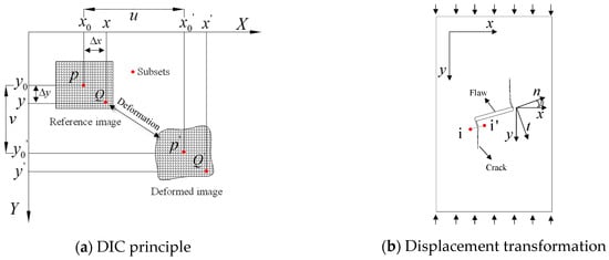 The DIC, also known as the digital speckle correlation method, obtains deformation information of the region of interest by performing correlation calculations on two digital images before and after sample deformation. The DIC method directly obtains the displacement and strain information by processing the digital images of the measured object surface before and after deformation. As shown in Figure 2a, we establish a coordinate system, select the area to be studied, divide it into a grid set, and determine the center point P/P’ of the subset. The image before deformation is called the “reference image” and after deformation is called the “deformed image”. When the specimen surface is deformed, the same subset in the reference image and the deformed image (the images are provided by an ultra-high-speed camera) is correlated according to the normalized cross-correlation criteria. The displacement and strain after deformation are expressed in Figure 2b, which is a schematic diagram of displacement transformation [19], where Equation (8) is the displacement relationship before and after deformation and Equation (9) is the strain relationship before and after deformation.