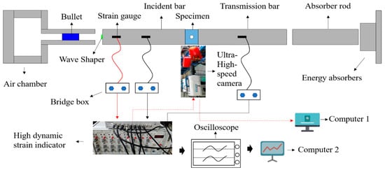 In order to carry out dynamic tests under impact loading, this paper uses a 50 mm-diameter SHPB device, as shown in Figure 3, and the test system includes a calculation and analysis system, a trigger and synchronous control system, an illumination system, and a high-speed camera. The bullet velocity and incident wave amplitude are controlled by adjusting the air compressor pressure, and the impact air pressure for the SHPB test in this paper is 0.18 MPa, and the shooting duration, trigger delay, frame rate, exposure time, and image resolution of the high-speed camera are set to 900 , 50 , 200,000 fps, 500 , and 924 pixel × 768 pixel, respectively.