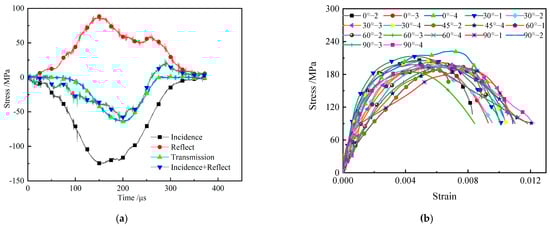 Firstly, the dynamic stress balance test was carried out. Taking the 60° specimen as an example, with the loading air pressure of 0.18 MPa, the stress balance diagram is drawn in Figure 4a.