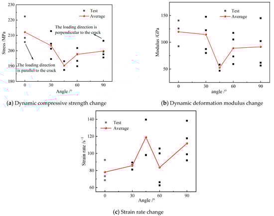 Figure 5a clearly demonstrates the pattern of strength variation. The average strength of the 0° specimen group is the highest, and the strength is greatest when cracks are arranged along the loading direction. With an increasing crack angle, the strength of the specimen shows an overall “V” shape change, which is consistent with the findings of the literature [22,23]. However, the average strength of the lowest crack angle is not consistent, the peak strength increases with the crack angle, and the overall strength of the specimen follows a “V” trend of attenuation. The dynamic compressive strength is sorted as 0° > 30° > 90° > 60° > 45°, and the specimen group has the lowest average strength at a crack angle of 45°. The possible reason for this is related to the damage angle of the rock material. The trend of the dynamic modulus of deformation in Figure 5b is consistent with the dynamic compressive strength, and it also shows a “V” trend attenuation as the angle of the crack defect increases.