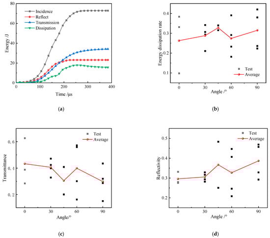 Generally speaking, the dissipation rate and reflection rate of the 45° specimen group are higher than those of the other angles, and the transmittance is lower than those of the other angles. In order to better summarize the law of energy consumption of the specimens with different angles of crack, it is now plotted in Figure 6b–d.
