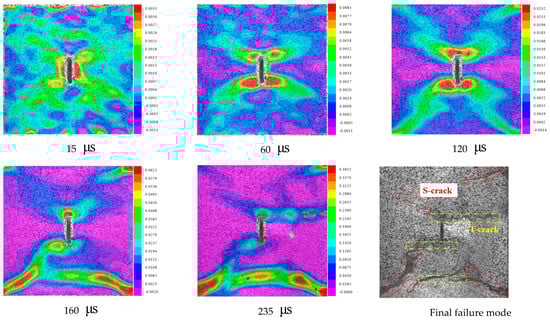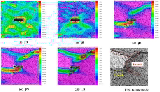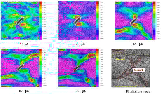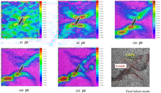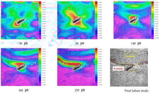 Figure 8 presents the main strain rupture evolution of a 30° pre-existing crack. It can be found that there is a local high strain around the crack tip of the 30° specimen at 10 , which increases as the load continues to advance; at 60 , the crack tip of the specimen produces a local strain concentration at roughly a certain angle with the loading direction; and with the further increase in the impact load at 140 , a small shear zone is formed in the strain concentration area, which is similar to that of the 0° specimen, with the appearance of the rock chip ejection phenomenon. At 140 , with the continuation of dynamic loading, an initial tensile crack starts to form in the small shear zone of the strain concentration area and expands to the loading end to form two macroscopic shear cracks; at the same time, tensile cracks generate in the distal end of the crack, which terminate at 160 , and the integrity of the specimen is lost. At 235 , the two macroscopic shear cracks and the far-field tensile crack penetrate through the whole specimen, which ultimately leads to the composite shear–tensile damage of the specimen.