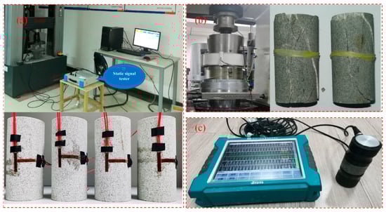 Test process: (a) Uniaxial compression test; (b) Triaxial compression experiment; (c) Acoustic detection diagram.