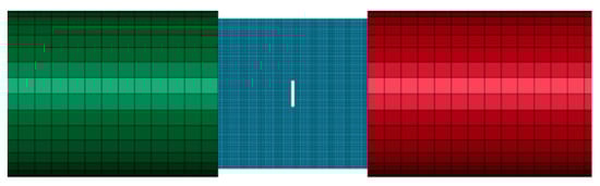 The SHPB dynamic compression numerical test is carried out according to the numerical specimen of the indoor impact test, and the simulation parameters are the same as the working conditions of the test. The morphology of sandstone damage and destruction, as well as the stress–strain characteristics of the specimen, are compared and verified with the test. Taking the 90° fracture group as an example, the size of the numerical specimen is the same as that of the SHPB test, and the numerical size of the rod is the same as that of the test: the length of the incident rod is 2200 mm, and the length of the transmission rod is 1800 mm, with a diameter of 50 mm, and the mesh size of the numerical specimen is 0.5 mm, and the size of the rod is 5 mm, see Figure 17 for details, and the contact mode is automatic face-to-face contact. For the pre-processing session, the LS-DYNA software is used in this paper for modeling and meshing to generate the required k-files. Subsequently, the k-files were modified and computationally set up in LS-PrePost as necessary. To control the boundary conditions, the *BOUNDARY_SPC_SET keyword is used to constrain the six degrees of freedom of the transmissive rod. In terms of circumferential pressure loading, the dynamic relaxation method (ramp loading) is adopted in this paper to avoid the non-convergence problem in the computational process. In particular, the loading air pressure of the dynamic shock is set to 0.18 MPa. Firstly, this paper applies the initial stress using the ramp load, and then based on the time–stress curve at 0.18 MPa (shown in Figure 4a), the loading is applied on the incident bar by the LOAD_SEGMENT_SET keyword.