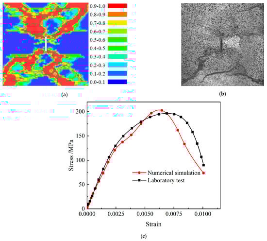 Damage failure diagram: (a) Numerical result; (b) Test result; (c) Stress−strain characteristics.