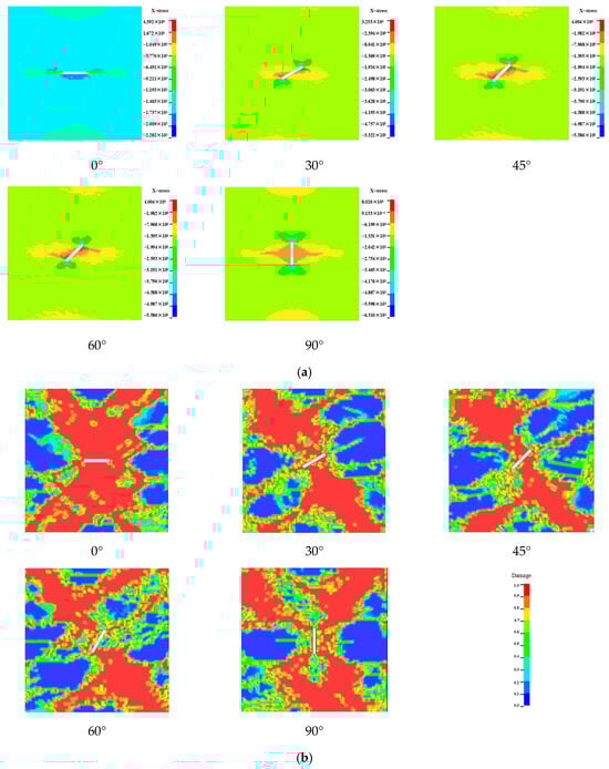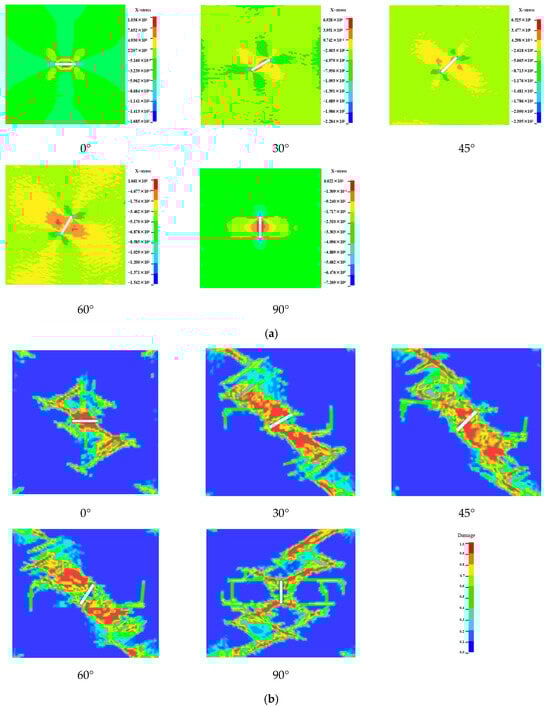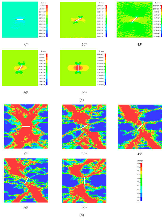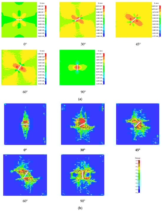 Using the validated numerical model, the perimeter pressure was set to 15 MPa and 30 MPa to initialize the stresses in the sandstone model with different angles of crack, and the initialized stress distribution diagrams were obtained as seen in Figure 19a and Figure 20a, compared with the perimeter pressure of 15 MPa. The perimeter pressure of 30 MPa increases the distribution of the stress values; the diagrams show the stress concentration around the crack clearly, the maximum value of the initial stress appears at the tip of the crack, and the minimum value is approximately perpendicular to the direction of the crack. This indicates that the direction perpendicular to the crack is usually in the region of compressive stress concentration under peripheral pressure, and the direction along the crack is in the region of tensile stress concentration, of which the initial stress values are the largest at the crack inclination angles of 30° and 45°.