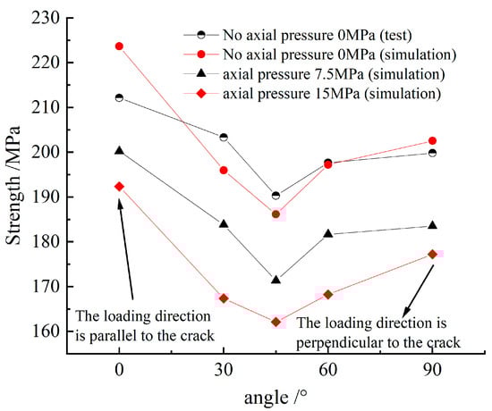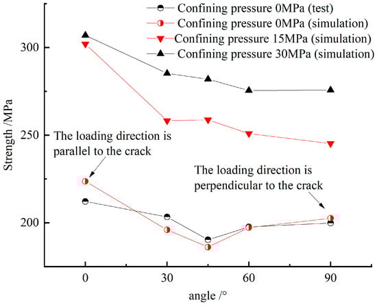 We extract the strength values of the fracture-containing numerical specimens under each axial pressure condition and plot the relationship with the fracture angle in Figure 24.