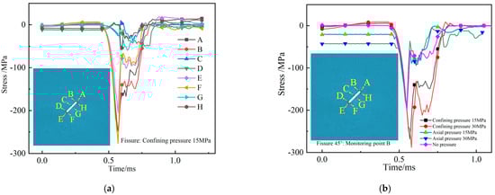 Stress–time curve of fractured sandstone monitoring points: (a) Different monitoring points; (b) Different initial stresses.