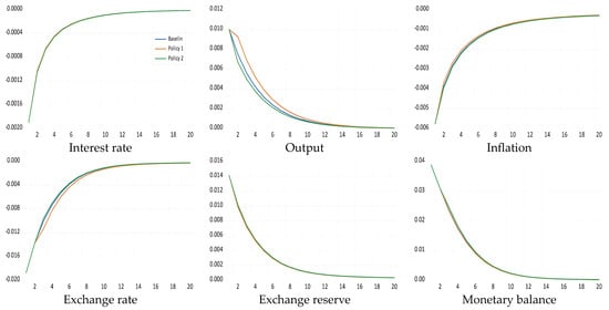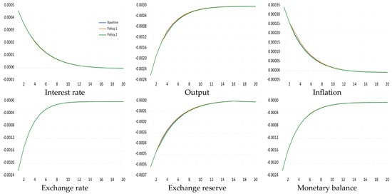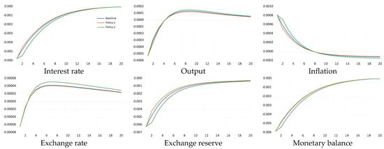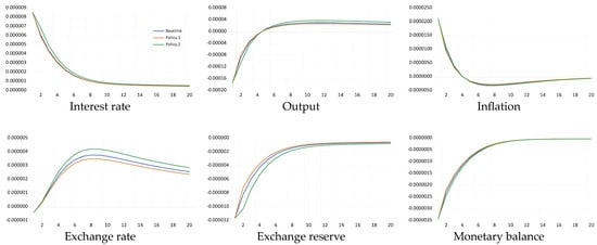 Figure 3 presents the impulse responses to foreign demand shocks under different exchange rate policy objectives. Compared to interest rate policies, adjustments in exchange rate policies more significantly affect the benchmark interest rates and the nominal exchange rate. Policy 1, which aims to stabilize the exchange rate, exhibits significantly less volatility in the nominal exchange rate compared to the baseline model and Policy 2, which seeks to stabilize currency value. Additionally, Policy 1 enhances the positive impact of foreign demand on baseline interest rates due to increased foreign reserve elasticity, reflecting a central bank preference for stable exchange rates. In scenarios with distortions to uncovered interest rate parity, this policy also reduces the costs associated with capital outflows, leading to increased short-term capital outflows and domestic financial pressure, which in turn amplifies the impact on interest rates. As a result, Policy 1 also boosts the positive shock to total output and more effectively mitigates inflation compared to Policy 2, or the baseline model, establishing it as a superior policy choice given its impact on economic fluctuations. In comparison with existing literature, both similarities and differences emerge. Consistent with our findings, Yang [121] and Guzman et al. [122] observed the effectiveness of exchange rate stabilization policies in reducing economic volatility. Conversely, Fornaro [123], Bahmani-Oskooee and Baek [124], and Ha et al. [125] reported lesser impacts on inflation. Buera and Shin [126], Korinek [127], and Suh [128] highlighted the unintended consequences of increased capital outflows, aligning with our observations of heightened domestic financial pressure under Policy 1. This synthesis of our results with prior research enhances the understanding of policy impacts on South Korea’s economy under various economic shocks.