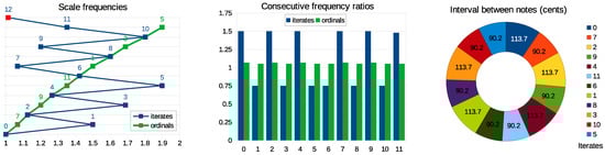 Figure 1 (left and central panels) displays how the 12-tone cyclic scale for (Pythagorean scale) is formed. The h iterates of indices and are the extreme tones, while provides the closure, since there is no other tone with a frequency that is between and the fundamental. The ratio between consecutive iterates is either or , except for the last iterate (the wolf fifth), which compensates for the comma. When the scale tones are arranged in pitch order, i.e., by ordinals, their ratios are either or . Such a distinction is much clearer under the following alternative approach.