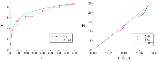Figure 2 displays how entropy increases in terms of the number of tones of a Pythagorean scale. The left panel refers to the scales with a lower number of tones, while the right panel shows the larger trend (in logarithmic scale), by making explicit the values of .