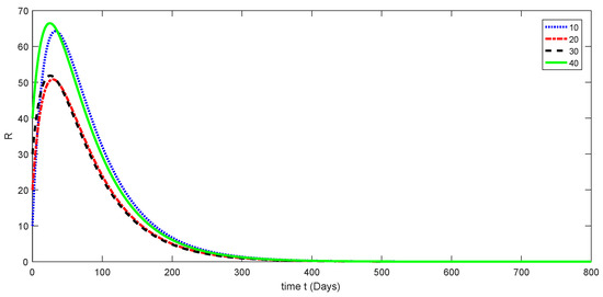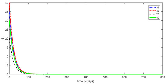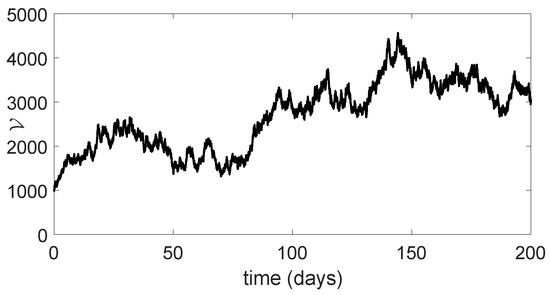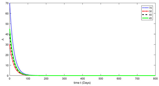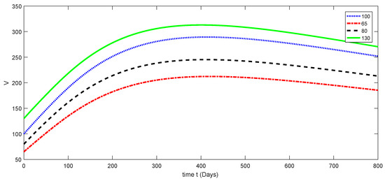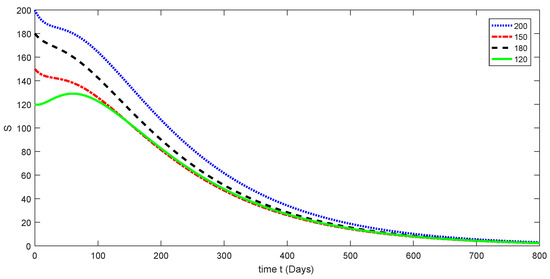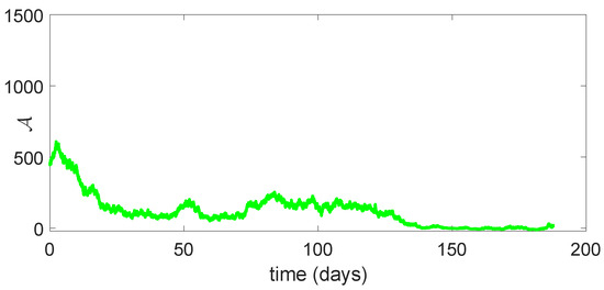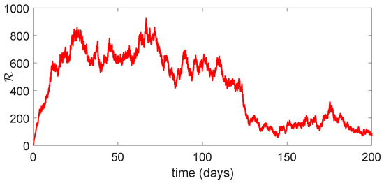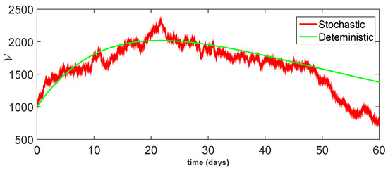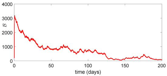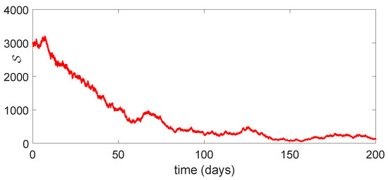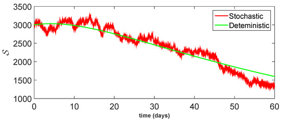 Using the same numerical data of Table 2, we simulate the model (23). We take The concerned dynamics of the different classes under the stochastic concept is given in Figure 8, Figure 9, Figure 10, Figure 11, and Figure 12, respectively. We take