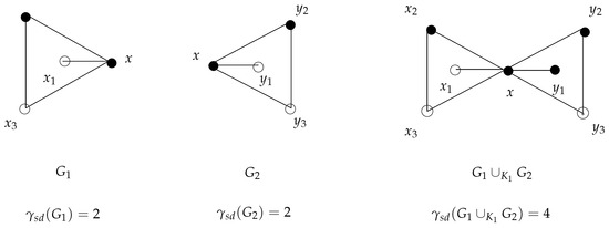 Let S be an ssds for . If , then adding an edge e does not make any difference, so that S is a set for G. Suppose either or , say . Then, is an ssds for G. Therefore, . Suppose and . Without loss of generality, let . Then, gives an ssds for G. Therefore, . Hence, . □