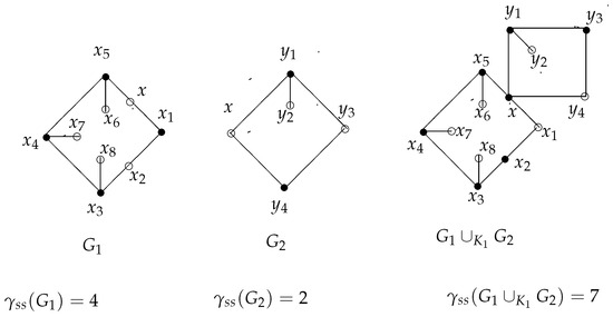 Let us prove the lower bound. Let X be a -set of and , where and . Let . As in the proof of Theorem 5, and are secure dominating sets. Moreover, and are strong secure dominating sets of and , respectively. Therefore, . Assume that . Suppose x has two defenders in X, one in and another in , then and are secure dominating sets. If x has no strong neighbor in but in , then and are strong secure dominating sets of and , respectively. Similarly, if x has no strong neighbor in but in , then and are strong secure dominating sets. Therefore, .