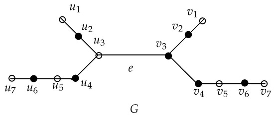 Assume that . Then, by Proposition 2, T can have at most three support vertices. Suppose T has exactly one support vertex. Then, the support vertex must have 3 pendant neighbors and so . Assume that T has exactly two support vertices. Then, T is , where and . By Proposition 2, we have . If , then T is a path. Since , we obtain ; these graphs are listed in . If , without loss of generality, assume that and , then . When T has exactly three support vertices, T is isomorphic to the graph . The converse is obvious. □
