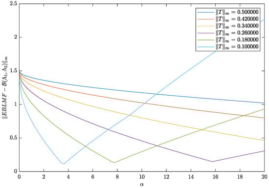 This section illustrates the generalization presented in this paper with the previous results in [20] in their graphical forms to provide a comprehensive understanding. The differences were handled using the infinite norm (3) since the comparisons run over matrices. The size of all matrices used here is . The choice of the used matrices is and , as in [20], while is a matrix chosen to be approaching the zero matrices, .