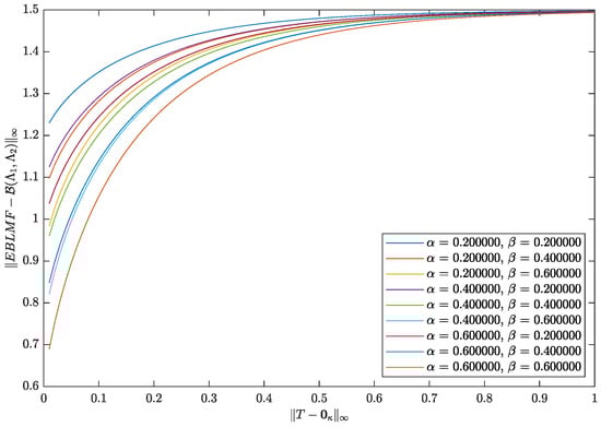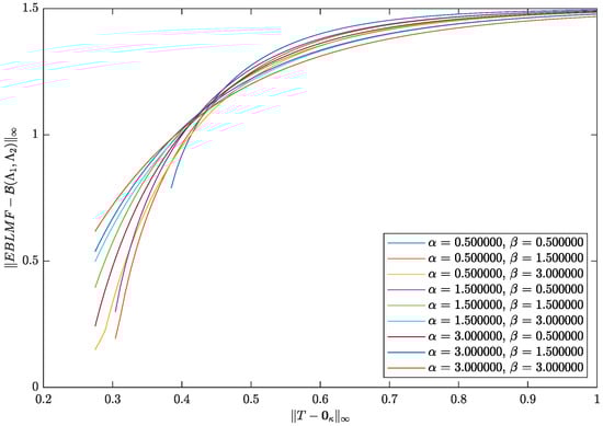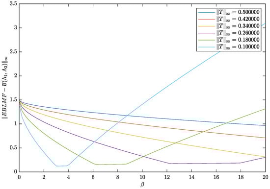 Figure 1 shows the graph of the differences between the EBLMF and beta matrix function against various values of in the interval for multiple choice of matrix having infinity-norm starting from 0.5 and approaching 0 and taking . As value increases, the difference decreases when is not close to . However, for approaching zero matrices, the difference decreases for small values of and then it changes direction. That is because of the trade-off between and the choice of in (17). Similar observations can be made when fixing and plotting the differences versus , as shown in Figure 2.