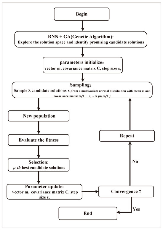 The application of CMA-ES optimization to our RNN model involves refining the hyperparameter search by adaptively updating the search distribution based on the fitness landscape. Unlike the GA, which relies on mutation and crossover operators to explore the solution space, the CMA-ES updates the covariance matrix to control the direction and magnitude of the search steps. First, we apply the GA to explore the solution space and identify promising candidate solutions. These solutions serve as initial points for the subsequent CMA-ES optimization. Next, we apply the CMA-ES to fine-tune the hyperparameters (e.g., the mean vector m, covariance matrix C, and step size ) and weight initializations of the RNN model, guiding the search towards optimal solutions based on the updated covariance matrix. This process iteratively refines the search distribution, ultimately leading to improved model performance [39]. The flowchart of hybrid algorithm is illustrated in Figure 5.